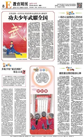 这份荣誉,源于多重力量的共同托举。二年级时,校园武术展演中高年级学长的精彩表现,在周俊杰心中种下了武术的种子,他找到老师表达“想学好武术”的愿望。此后,这份纯粹的热爱,成为他习武之路的核心动力——课余时间,别的同学在玩耍时,他总抱着武术动作图解反复研究;回家后做完作业,也第一时间对着镜子练习抱拳礼、弓步冲拳,连最喜欢的动画片都甘愿为训练“让路”。兴趣让“吃苦”变成了他每天最期待的事。