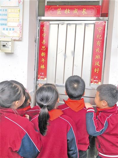 新年到来之际,作新小学的校园里一片红彤彤的,每个班的教室门口都贴上了由师生们共同撰写的对联,以此来激励孩子们在新的一年快马扬鞭、马到成功。图为208班的孩子们在用心体会对联的独特韵味,从小在心田里种下热爱中华文化的种子。(陈柳)