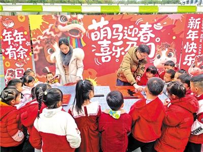 随后,孩子们在前后操场分区体验活动。在书画创作区,孩子们观摩了老师挥毫书写春联的过程,感受笔墨之间的气韵,并在老师的指导下,亲身体验了书写“福”字,一笔一划间将美好的新年祝福倾注于宣纸之上。在文化体验区,孩子们有的在学习对折剪出简单的窗花,把红色的彩纸变幻出吉祥的图案;有的动手体验拓印工艺,将模板上的图案复刻到宣纸上,感受传统复制技艺的奇妙;有的和老师围绕“马”的吉祥寓意展开交流,并共同合作完成一幅寓意前程似锦的《百骏图》作品;有的利用扭扭棒等材料,发挥想象力制作小巧精致的灯笼。