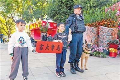 花市上,放寒假的小朋友举着 “马年大吉” 的祝福,与特警、警犬定格下开怀瞬间。守护万家,万家安详,是最美“警”色。