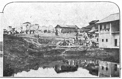 丙镇全景(逢四、九为墟期,约有商店五百余间,可乘梅丙公路汽车达此)。