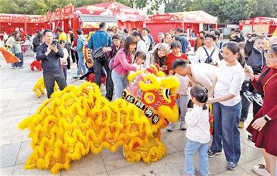 醒狮与市民游客欢乐互动。(林翔 摄)
