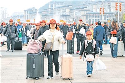2月22日,来自贵州的务工人员及家属在凯里南站搭乘开往浙江宁海的G2334次列车,踏上返岗旅途。这是春节假期贵州开行的首趟返岗务工专列,助力务工人员顺利返岗、企业有序复工复产。(新华社发)
