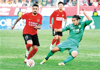 4月4日,北京国安队球员张玉宁(右)与辽宁铁人队球员费利佩(左)拼抢。