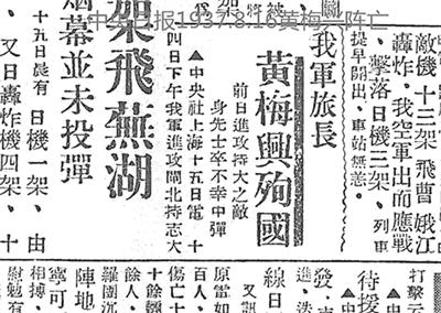 ▲1937年8月16日《中央日报》对黄梅兴殉国的报道。
